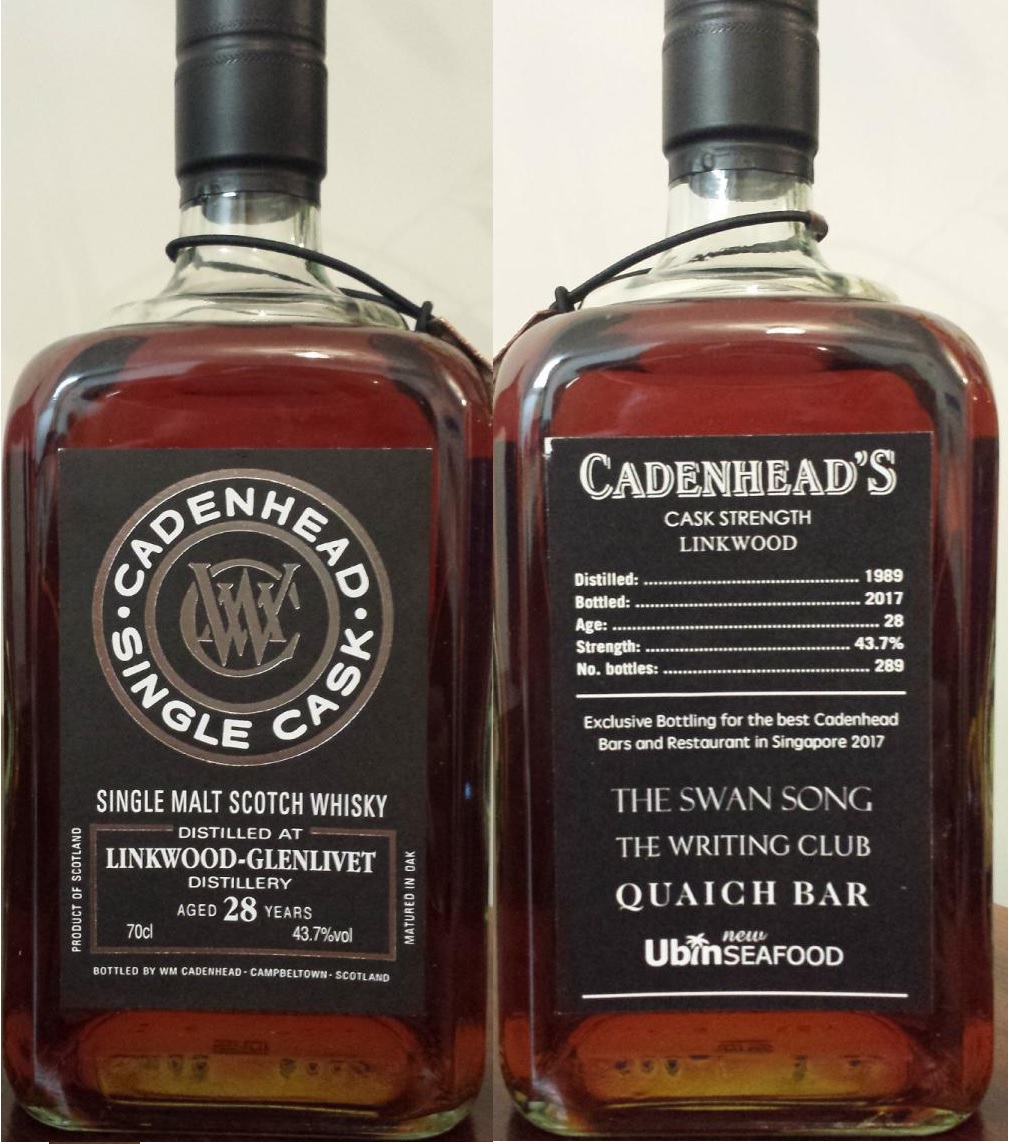 If you are browsing these pages and are familiar with the local Whisky scene, you would know Khoon Hui, whisky godfather and proprietor of Quaich Bar, the very first Whisky bar in Singapore. Khoon Hui had an idea for a joint bottling between some new Singapore whisky bars, and after some discussion and what must be several rounds, this 28 yo Linkwood was selected. On the back label you will find their names: The Writing Club (Soo San, at Palais Renaissnace, Quaich Bar, The Swan Song (Arun and Kelvin, at Prinsep Street), and of course New Ubin Seafood (not a bar per se, but hey they outdrink us all).