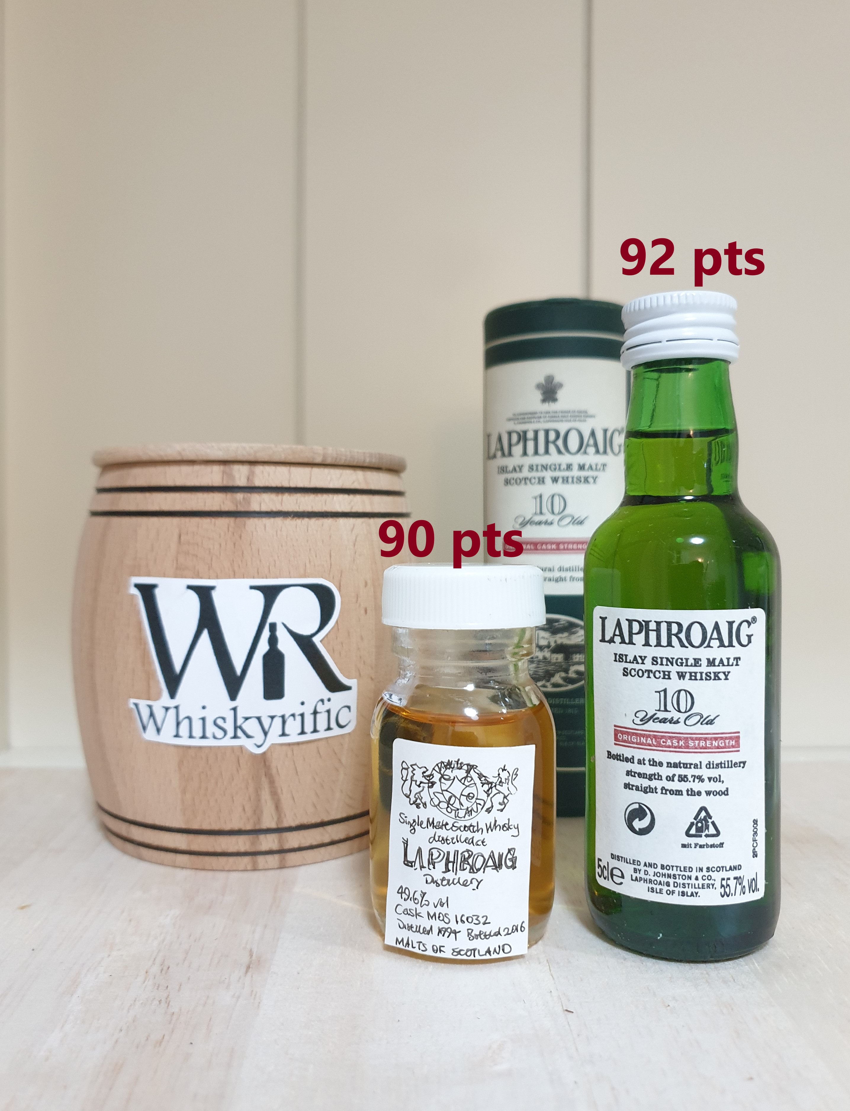 So, step back another handful of years. Yes, a brooding peat, dripping like a black tincture, swirling with glints of browns and blacks, a veritable chorus of dark earthy tones. Nonetheless, I would venture to say the green stripe remains unsurpassed, but that is not to cast aspersions on this exceptional whisky. This version veers closer to the sea, I think, and the seaside aspects really batters the tongue, where the image of a fully operational fishing harbour, with all its scents, bubbles forth. 92 pts It should be noted that none of these older Laphroaigs reek of the extreme peat and medicine of later years, which I am not a fan of.