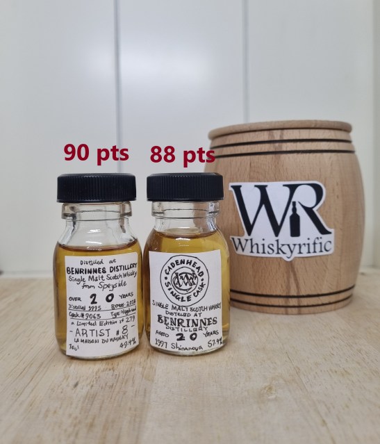 Lots of wonderful yellow hues, warm honey, fresh hay, baked apples and apricots with cream, golden syrup, toffee and vanilla pods. Just a little tense green outline in sprigs of mint, and dill outline this very firm whisky beautifully. Chalky loam and a simmering chardonnay reduction. Weighty olive oil with a sooty edge, All without a smear of sulphur, which can sometimes appear in Benrinnes but doesn’t here. Seriously drinkable. 90 pts