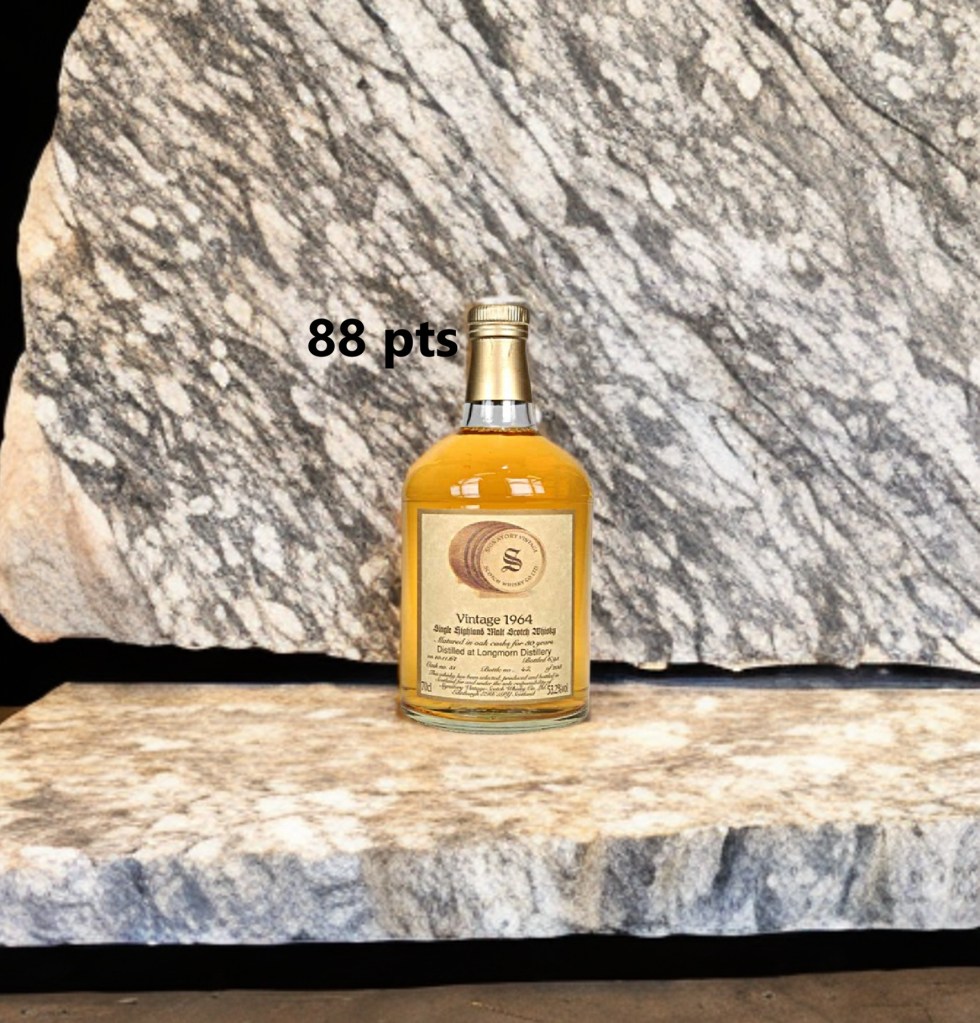 Going a little further back into the 60s this one shows a clean earthiness, almost medicinal. A profile that brings to mind a whole era of old whisky rather than any one distillery. We have cold machine rooms, straw strewn floors and singer oil. Slices of old ginger, mushy forgotten pears and discarded grapefuit rinds. Camphor, patchouli leaf and wood spice, but not a touch of mustiness, dark fruit for sure though more fruit is wanted I think. 88 pts
